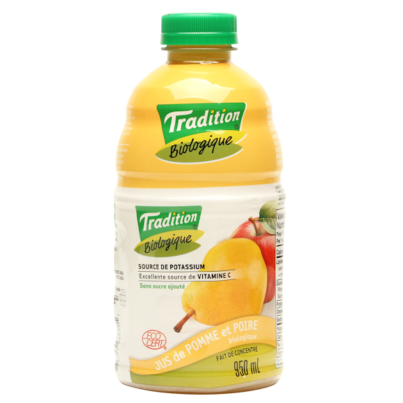 La texture du jus de pomme et poire biologique Tradition est onctueuse en bouche en raison de la quantité exceptionnelle de purée de poire qu’il contient. Il vous apportera un goût rafraîchissant équivalent à 100% de votre apport quotidien en vitamine C.